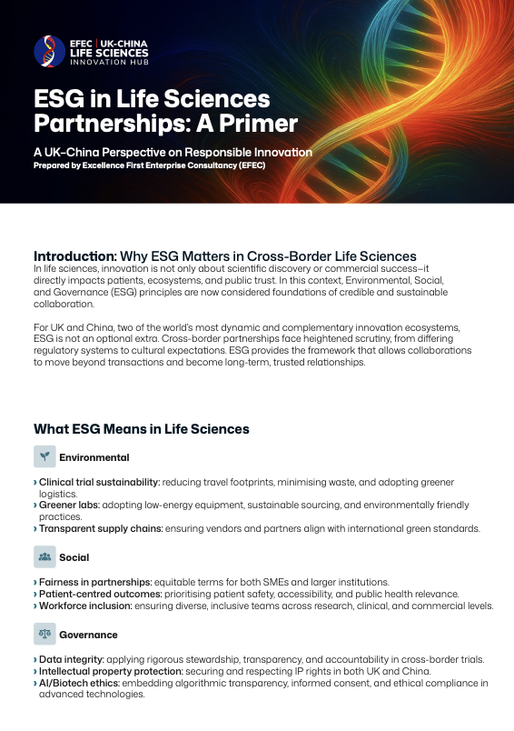 At the EFEC UK–China Life Sciences Innovation Hub, responsibility is not a policy — it is part of how we build. Every collaboration we facilitate across the UK and China reflects our belief that innovation must be both ambitious and accountable. Our focus on life sciences means we work where scientific progress intersects with human impact — areas that demand ethical, sustainable, and transparent practices.